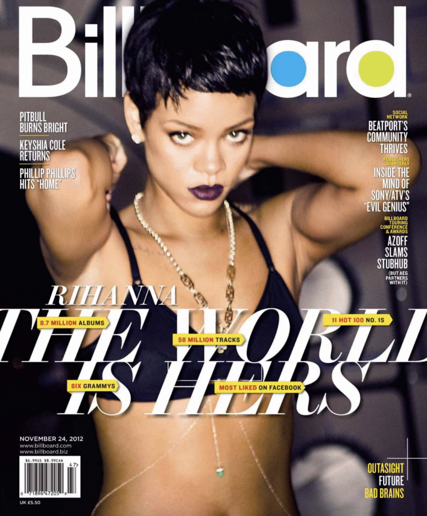 Billboard noted in its December 15, 2012 edition that “Rihanna has racked her total with 12 No. 1s, which also ties her (with Madonna and the Supremes) for the fourth-highest total. Only the Beatles (20), Carey (18) and Michael Jackson (13) have tallied more No. 1s.”