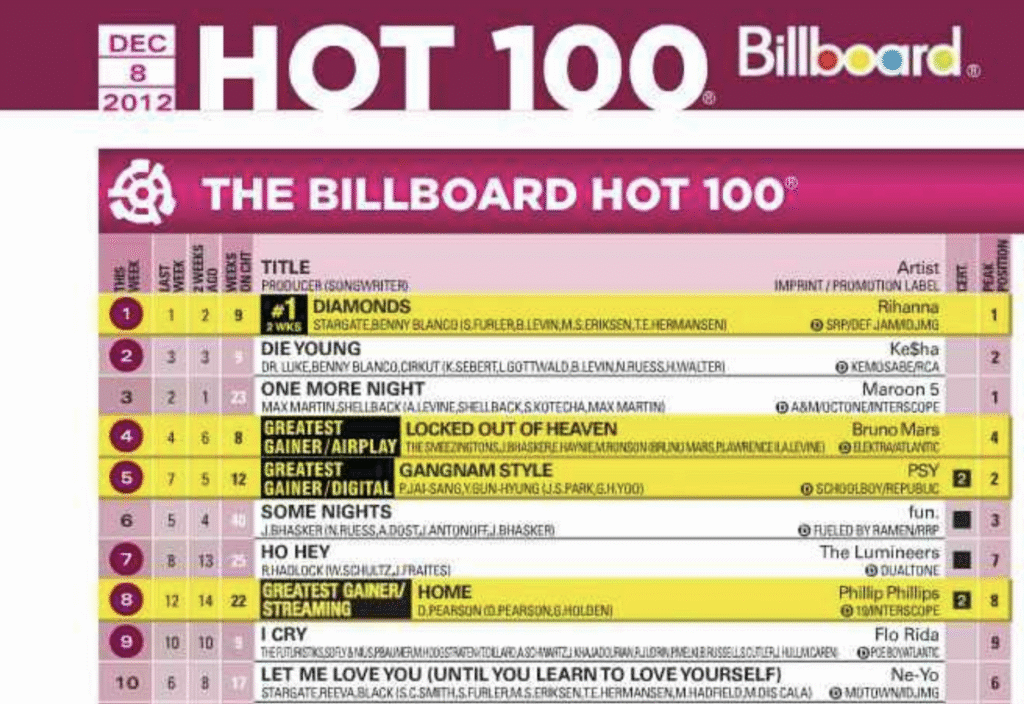 “Diamonds” quickly topped the music charts around the world. It became Rihanna’s 12th number-one song on the US Billboard Hot 100 chart, holding the top spot for three weeks. The song sold more than 10 million copies in the US alone, earning it Diamond certification from the RIAA—the highest award for sales. “Diamonds” also hit number one in more than 20 other countries, such as the UK, Australia, and Canada.