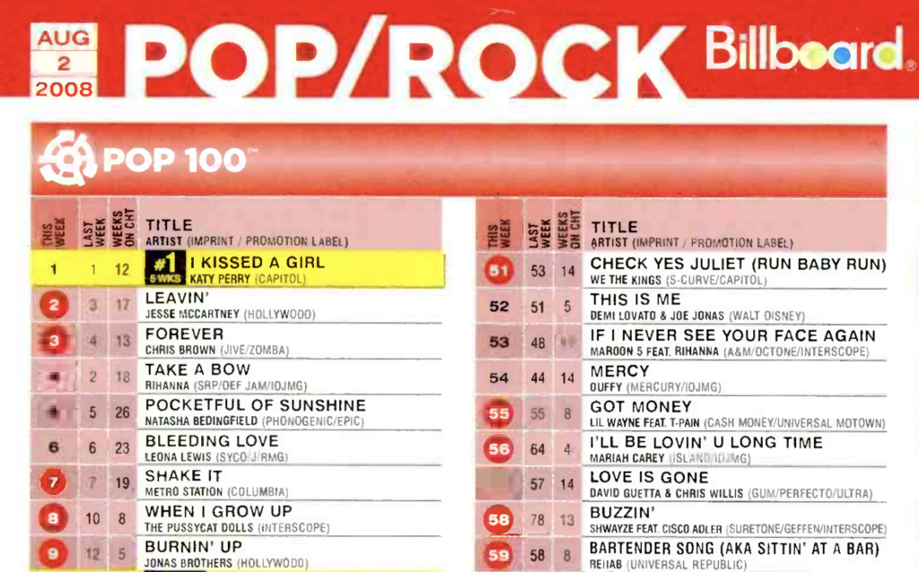 “I Kissed a Girl” debuted on the Billboard Hot 100 on May 24, 2008 and spent 23 weeks on the chart. The song held the Billboard Hot 100 No. 1 position for seven consecutive weeks from July 5 to August 16, 2008, made history as the 1,000th No. 1 song of the rock era, and topped charts in over 20 countries.