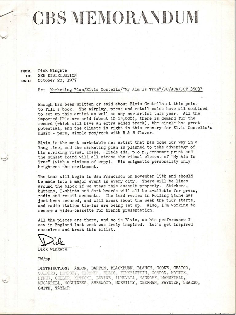 Dick Wingate, a product manager at Columbia, was executing the plan to introduce Elvis Costello and his album to American audiences. “Elvis Costello is the most marketable new artist that has come our way in a long time,” said Wingate. “His enigmatic personality only heightens the excitement.”