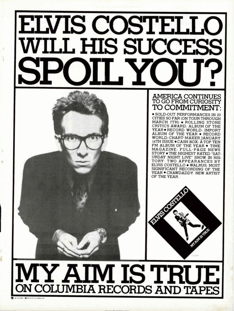 “The last date of Elvis Costello’s recent tour was in Asbury Park, New Jersey, where one observer met people who had flown in from Los Angeles…people who had driven from Boston…people who were following Elvis Costello around the country. We’ve never seen this much passionate excitement for a new artist with a month-old album. Let this be a warning to you,” declared a Columbia Records ad celebrating the success in Billboard and Record World.
