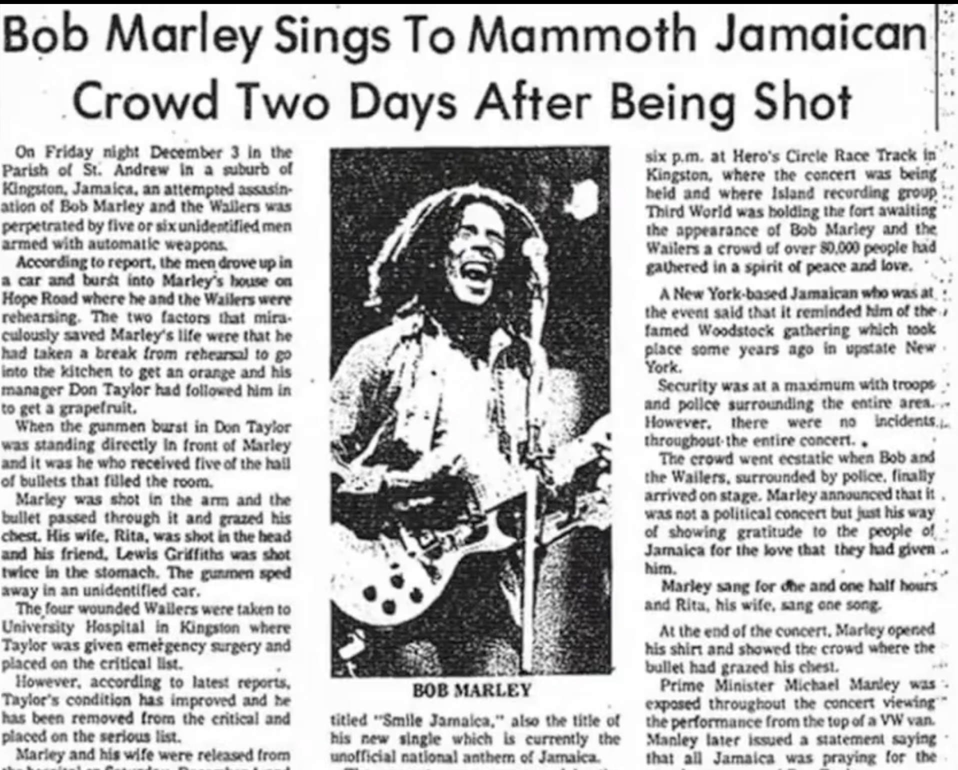 Two days later, Marley performed a 90-minute set before 80,000 people at National Heroes Park. When asked why he performed so soon after being shot, Marley stated, “The people who are trying to make this world worse aren’t taking a day off. How can I?”